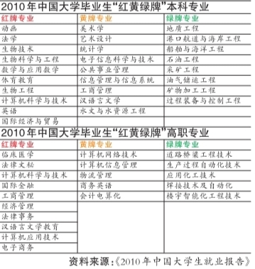 蓝皮书首次披露了2010年大学生“红黄绿牌”本科和高职专业名单。其中,红牌专业是指失业量较大、就业率持续走低,且薪资较低的专业,即高失业风险型专业;黄牌专业指除红牌专业外,失业量较大、就业率持续走低,且薪资较低的其他专业;绿牌专业则指薪资、就业率持续走高,且失业量较低的相关专业,即需求增长型专业。( 作者:周逸梅)