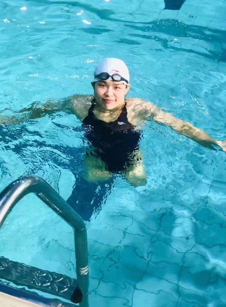 不过,虞亚楠学习游泳这段经历中,充满了常人难以想象的困难。第一次下水,印象就非常深刻。对一般成年人来说,在游泳池的浅水区,站立时一般能把头部露出水面。但于虞亚楠而言,在游泳里的任何一个角落她都无法浮在水面上,只能“被迫喝水”。