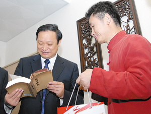 《思考中医》作者——广西中医学院刘力红博士向卫生部副部长、国家中医药管理局局长王国强赠送《思考中医》一书。