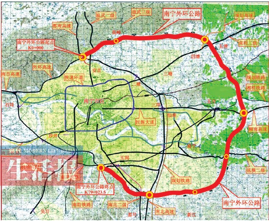 为了改善出行, 南宁外环高速公路项目于201010月开工建设,该项目起于南宁市西乡塘区永宁村附近,与现有环城高速公路安吉互通式立交相接,终点在良庆区玉洞工业园附近,与现有环城高速公路直接相接,呈“反C”字走向,经过南宁六城区,全长80公里,设计速度为120公里/小时,双向四车道。