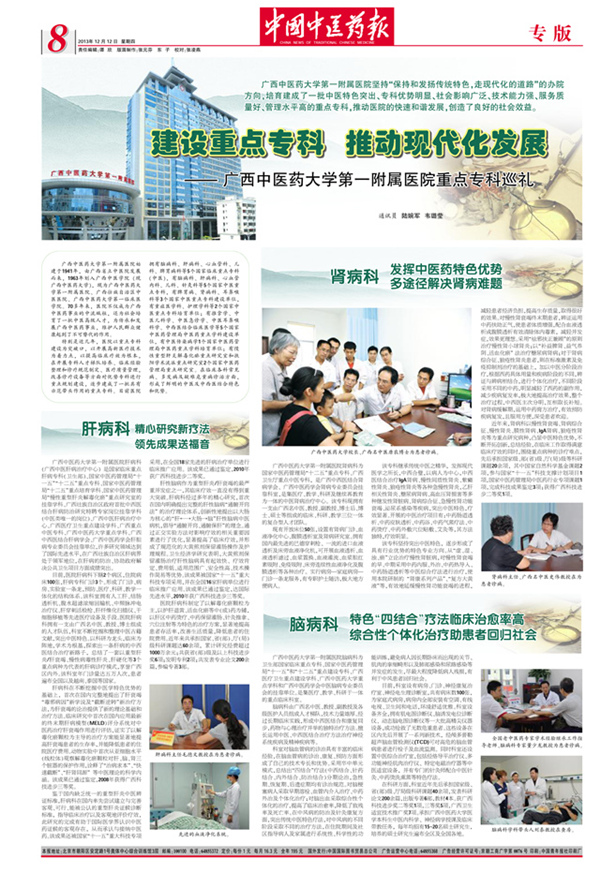 20131212日,《中国中医药报》在其专版整版刊登了题为《建设重点专科  推动现代化发展》的文章,对一附院中医特色突出、专科优势明显、社会影响广泛、技术能力强、服务质量好、管理水平高的重点专科进行了专题报道。