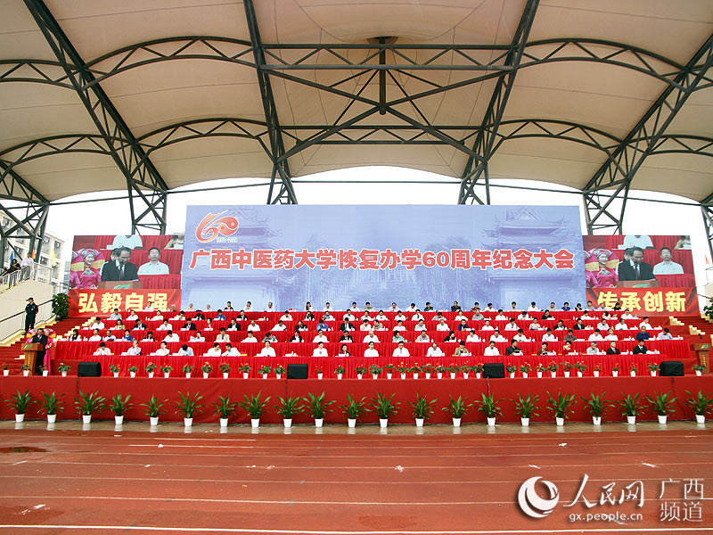纪念大会以奏响庄严的国歌拉开了序幕。自治区党委常委、宣传部部长黄道伟,自治区人大副主任刘新文,自治区人民政府副主席黄伟京,自治区政协副主席高枫,国家中医药管理局人事教育司司长卢国慧、科技司司长曹洪欣,高等中医药教育研究会理事长洪净和有关单位、部门、兄弟院校的领导出席了纪念大会。