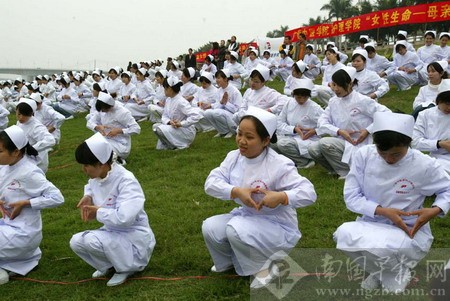 当日早上还不到8时,离放生活动开始还有两个小时,广西中医学院护理学院的女生们就陆陆续续来到了江滨公园活动现场。还不到9时,400多名女大学生就已经全部到齐。她们不顾初春早上的寒冷,纷纷换上了洁白的标准三件套护士服。有的女生对着镜子开始盘发带上了护士帽,有的脱下外大衣穿上了护士服,有的三五成群地聚在一起互相检查着对方的仪容,大家都兴奋地等待着活动的开始。
