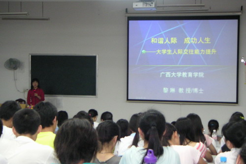此次讲座由广西大学教育学院副院长黎琳教授主讲。黎琳教授以《和谐人际,成功人生——大学生人际交往能力提升》为题,为我院学生作了一场精彩的讲座。黎教授以轻松的话语和她自身的经历,分别从“大学生的人际关系”、“人际交往的理论与技巧”和“大学生礼仪”三个方面为同学们讲述了和谐人际关系及技巧对大学生成长成才的重要性,使同学们深受启发,现场不时传来热烈的掌声。