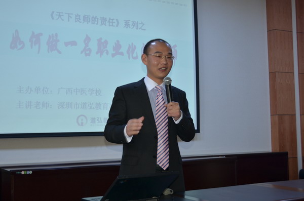 为进一步推进教师队伍建设,引导全体教职工构建合理的理论框架和能力结构,提升工作能力,广西中医学院护理学院邀请深圳市道弘教育集团高级讲师周雷老师于2012年2月21日在广西中医学院第一附属医院学术会议厅举办了主题为“如何做一名职业化的教师”的专题讲座,护理学院岑家铭书记、吴彬院长、罗艺徽副书记、周琦副院长、高滨洋副院长、林原副院长等领导出席了本次活动。讲座由吴彬院长主持。