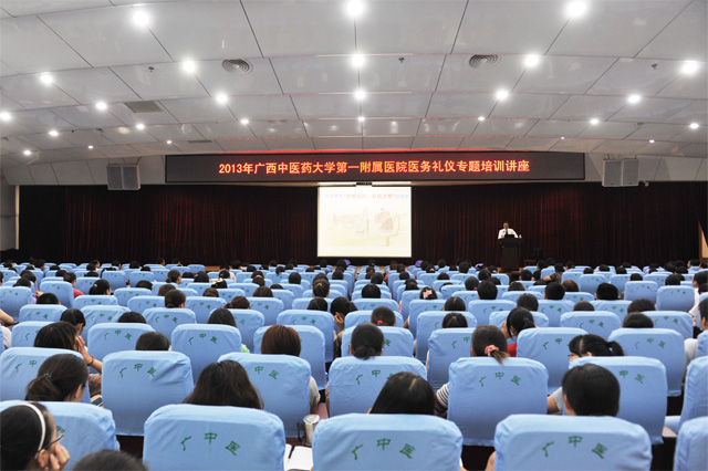 2013年7月11日下午,一附院在综合楼多功能学术厅举行“医务礼仪”培训。广西行政教育对外交流协会蒋京湘教授应邀为医院医务人员作了“医务礼仪”专题讲座。讲座由医院副院长周建国主持。共有500余人参加了培训。