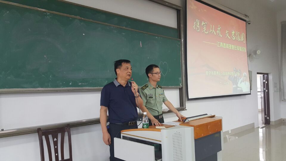 活动中,青秀区武装部童柏麒参谋讲解了2017年度大学生参军入伍的相关政策规定,重点介绍了参军的时间安排、年龄要求、身体素质要求、思想作风要求等普遍关注的事宜,鼓励广大爱国青年学生积极参军,努力成为现代化军队建设的坚强后盾。
