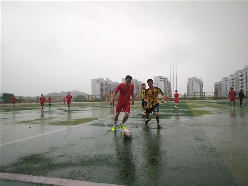 雨中的足球场地面潮湿,但这并不影响球员们的比赛热情。风雨中,他们传球、带球过人、射门,这一系列动作看起来都是那么的连贯、轻健,丝毫不为渐大的雨势所影响。这小小的足球在这风雨交加的赛场上更具魅力。双方队员精湛的脚法、完美的盘带、犀利的射门以及精彩的配合将比赛推向了高潮,足球场边的队员、观众亳不吝啬地为场上球员们献上最热烈的掌声及最高亢的欢呼。