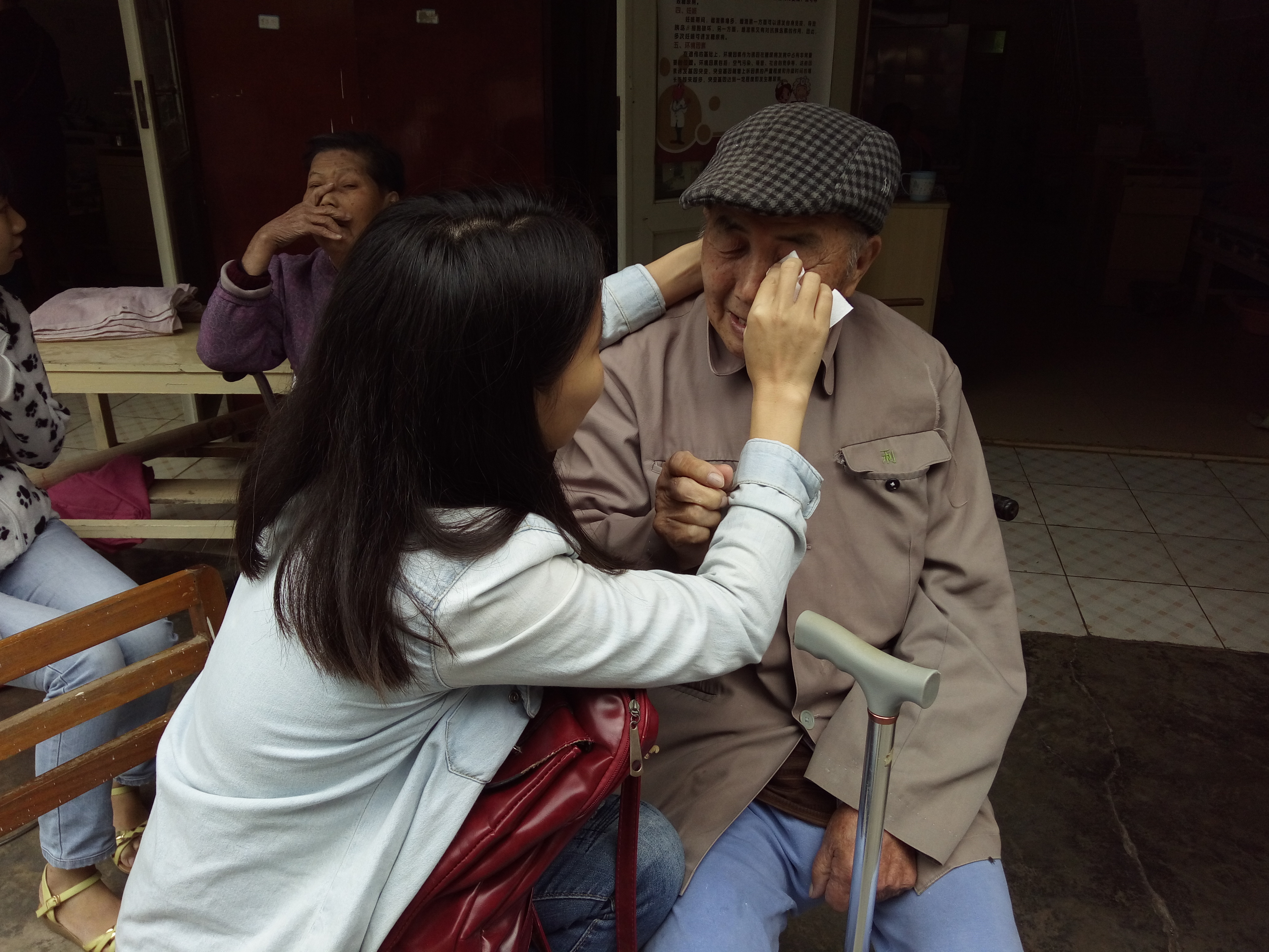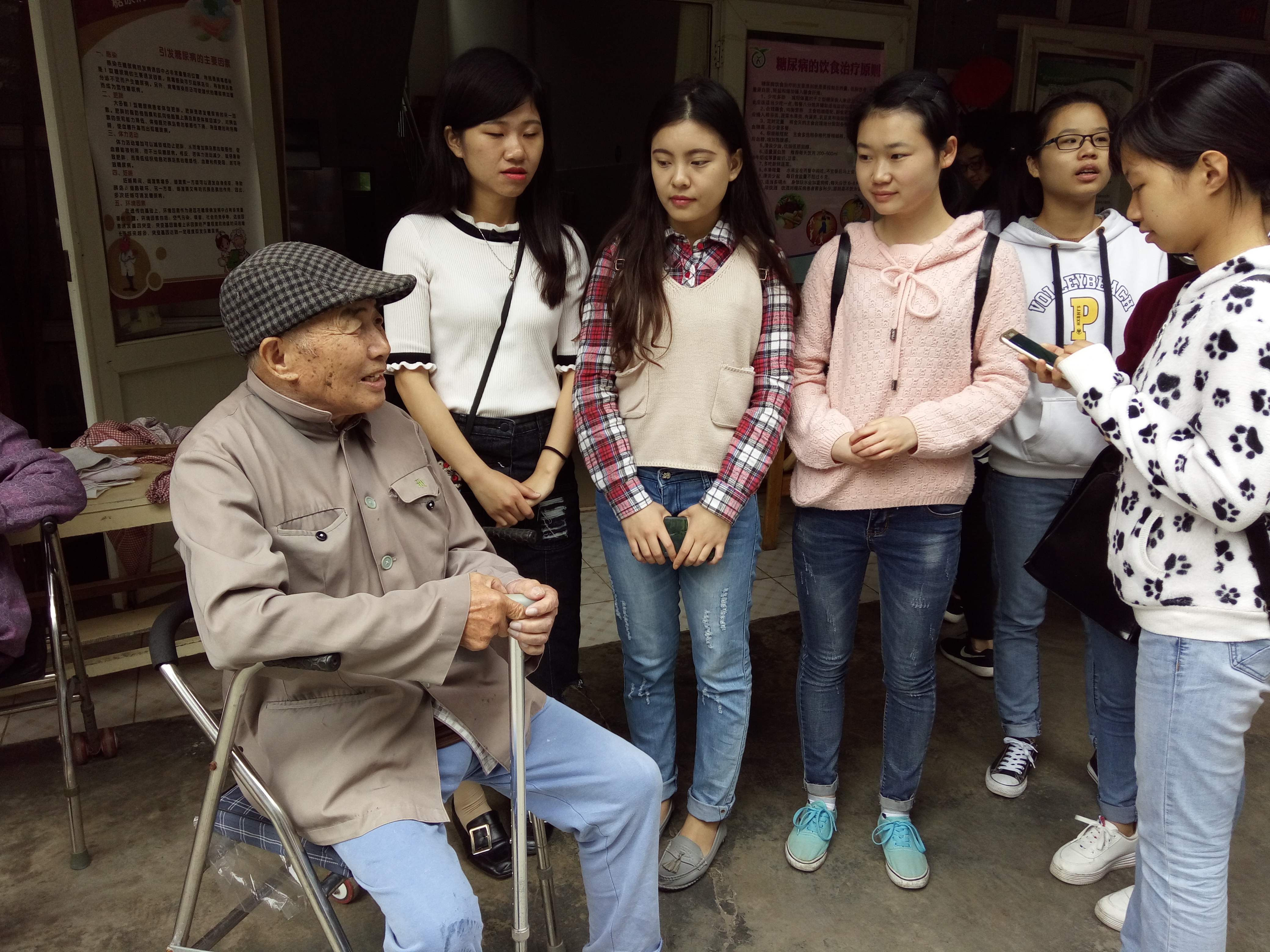 上午9点30分,20名学生党员、预备党员和入党积极分子组成的志愿服务队伍到达南宁市青秀区惠民护老院。一进入护老院,便受到了护老院职工和老年人的欢迎,其中一老爷爷更是以唱歌的形式表达了激动与感谢。接着,各志愿者以三四人为一组分别找老年人聊天,听着老年人回忆往昔的故事,感叹时光的飞逝。与此同时为老年人做些按摩,舒筋通脉,为老年人带去老年养生之法,很受老年人的欢迎。覃金英同志作为党员更是亲身力行,为老年人清除眼角的污垢,为众多参加志愿活动的同志作了良好的榜样。