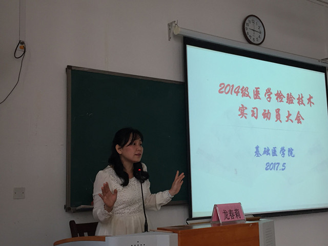 为确保基础医学院2014级医学检验技术专业毕业实习工作顺利进行,让同学们以积极正确的心态投入实习学习工作,2017年5月17日上午,基础医学院在仙葫校区1-204为2014级医学检验技术专业召开毕业前实习前动员大会。基础医学院党委副书记龙春莉老师为2014级医学检验技术专业共57名学生做了专题指导。大会由2014级医学检验技术班辅导员杨丽琴老师主持。动员会上,龙春莉副书记希望每一位同学珍惜此次实习机会,牢记“弘毅自强传承创新”的校训精神,在实习过程中展现taptap点点体育学子的优秀品质和精神风貌。同时龙书记还提出几点要求:一是遵守制度,认真严谨。要求全体实习生明确实习目的和要求,严格遵守校纪院规,保质保量完成毕业实习任务,不断提高自身综合素质和医学实践能力。二是虚心求教、关爱同学。精湛的医疗技术是一个长期积淀的过程,医学生实习过程中一定要向实习带教老师多请教,多主动承担工作,不断提升自己的技术和工作能力。实习中多主动关心同学,和睦相处,互相互助。三是增强安全意识,安全为重。提醒同学们多注意实习操作过程中的安全防范,此外还要增强自身安全意识,如不要轻信陌生人的话,避免落入传销组织等。