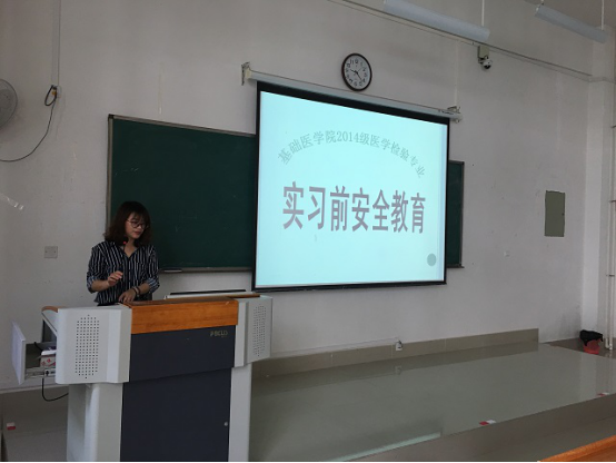 随后,2014级医学检验技术班辅导员杨丽琴老师给同学们开展安全第一,珍爱生命、遵纪守法,服从管理、重视就业,主动出击、信息通畅,有效沟通四个方面内容的专题实习前安全教育和注意事项,对学生毕业实习过程中的人身、医疗、交通、财产等安全进行了再教育。