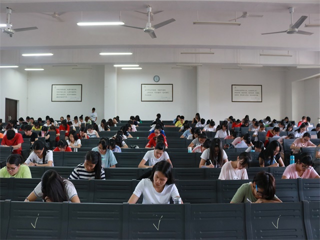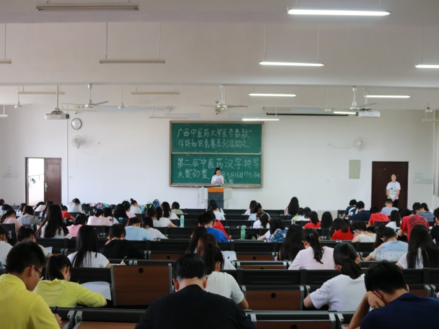 初赛吸引了包括基础医学院、药学院、赛恩斯新医药学院、针灸推拿学院、护理学院、壮医药学院等学院的学生,共668人参加。初赛形式为笔试,同学以个人为单位参赛。题目类型包括:根据汉字写拼音、根据拼音写汉字、根据文意选择词语、繁体字或异体字转化为简体字、补填有关医药成语等。考试内容来自医古文、中药学、方剂学、内经学、伤寒论等多门中医课程,充分、全面考查了同学们对于中医药汉字的理解和认读水平。初赛现场秩序井然,工作人员引导参赛选手入座并分发试卷。考试开始后,考生们低头沉思,奋笔疾书。