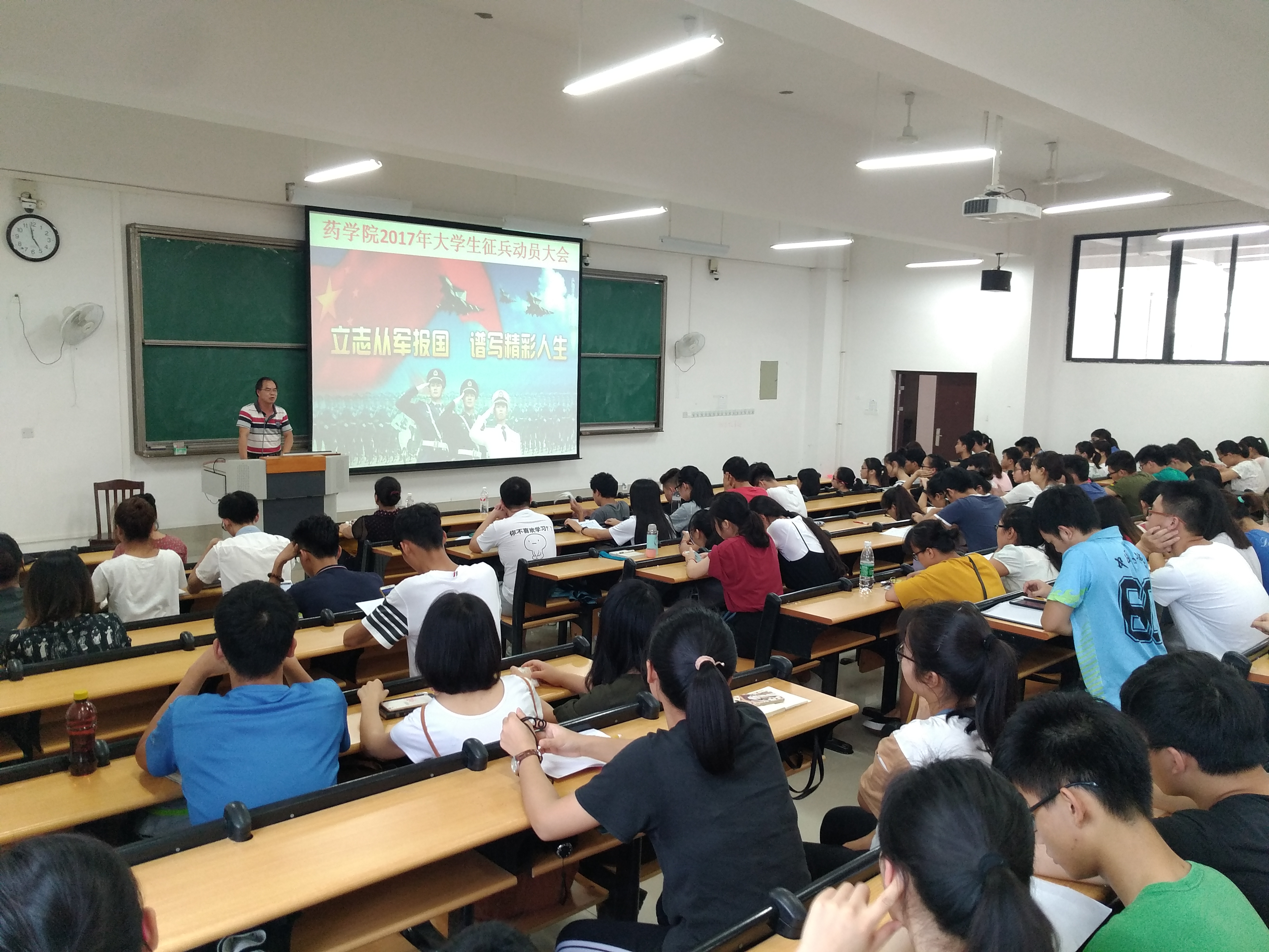 为了进一步落实学校征兵工作会议精神,做好大学生征兵入伍宣传工作,更好的号召药学院大学生应征入伍。6月28日下午5时,在仙葫校区教学楼1-309教室,药学院召开了2017年大学生征兵工作动员大会。出席会议的有武装保卫部代表,药学院领导、老师,退伍复学同学,学团骨干,学生党员等200余人。