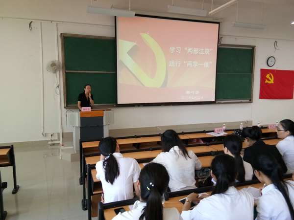 会议伊始,韩叶芬副书记给与会党员进行关于党的两部法规的精彩授课,要求同志们严记党规党章,遵守党内纪律,守住做人做事的基本底线;在纷繁复杂的社会能坚定自己的信念;在日后生活中立德修身,陶冶情操。随后,庄严肃穆的国歌响起,党员毕业生先后进行思想交流,积极分享自己的学习实习经验,让我们看到了团结协作,相亲相爱的护理学院是一家人的和睦景象。