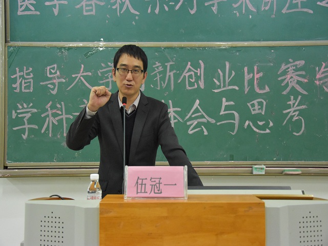 为了更好的指导同学们的大学生创新创业比赛、科学竞赛,丰富同学们的大学活动,激发同学们创新创业意识。2017年12月5日,基础医学院在仙葫校区教学楼1-101教室举办了以“指导大学创新创业比赛与学科竞赛的体会与思考”为主题的讲座,本次讲座由“taptap点点体育2016年度十佳学生最喜爱老师”、基础医学院伍冠一老师担任主讲,基础医学院近350名学生参加了本次讲座。