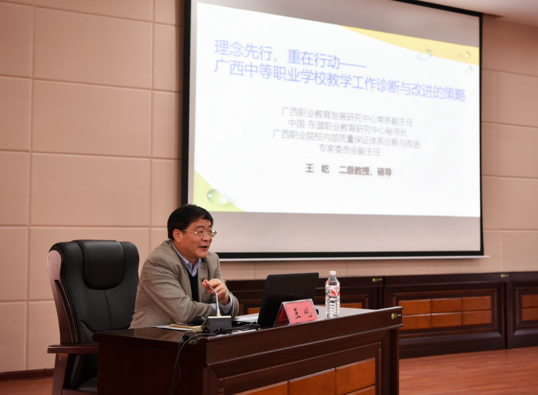 会议首先邀请了广西师范学院职业技术教育学院王屹院长开展题为《理念先行、重在行动—广西中等职业学校教学工作诊断与改进的策略》专题讲座,王屹分别从教学工作诊断与改进的内涵、教学工作诊断与改进制度的意义、教学诊改的主要任务以及教学工作诊断与改进的策略等四方面的内容进行了介绍。