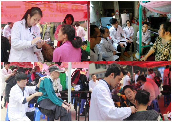 研究生学院党委书记黄贵华、副书记李朝晖等老师亲临现场指导活动,易蔚教授、杨力强教授、章晓云医师等专家现场义诊,80余名研究生参与本次活动,在邕宁区新兴社区中心广场为附近居民进行中医儿科、中医内科、中医骨伤科学等义诊,并开展了血压测量、推拿按摩、针灸、关爱空巢老人、常见病预防治疗知识问卷调查及心理健康咨询等健康服务。