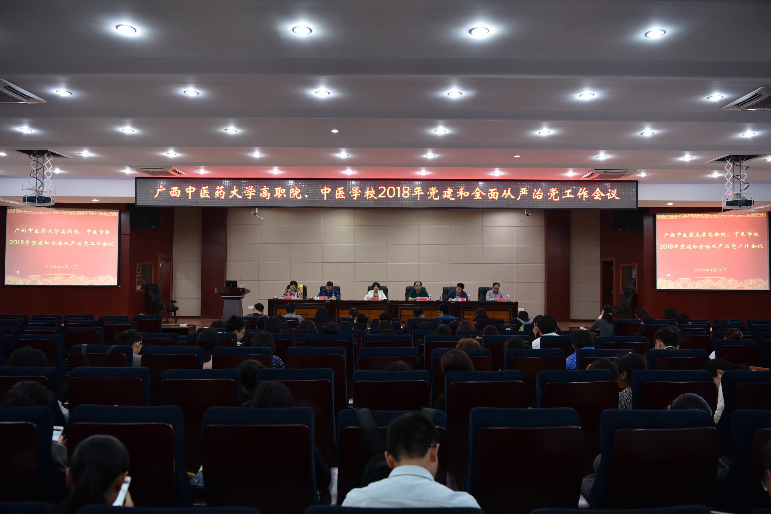 4月10日下午,高职院、中医学校党委在北湖校区多功能报告厅召开2018年党建和全面从严治党工作会议。高职院、中医学校全体党政领导、中层干部、全体党员和辅导员参加了此次会议。