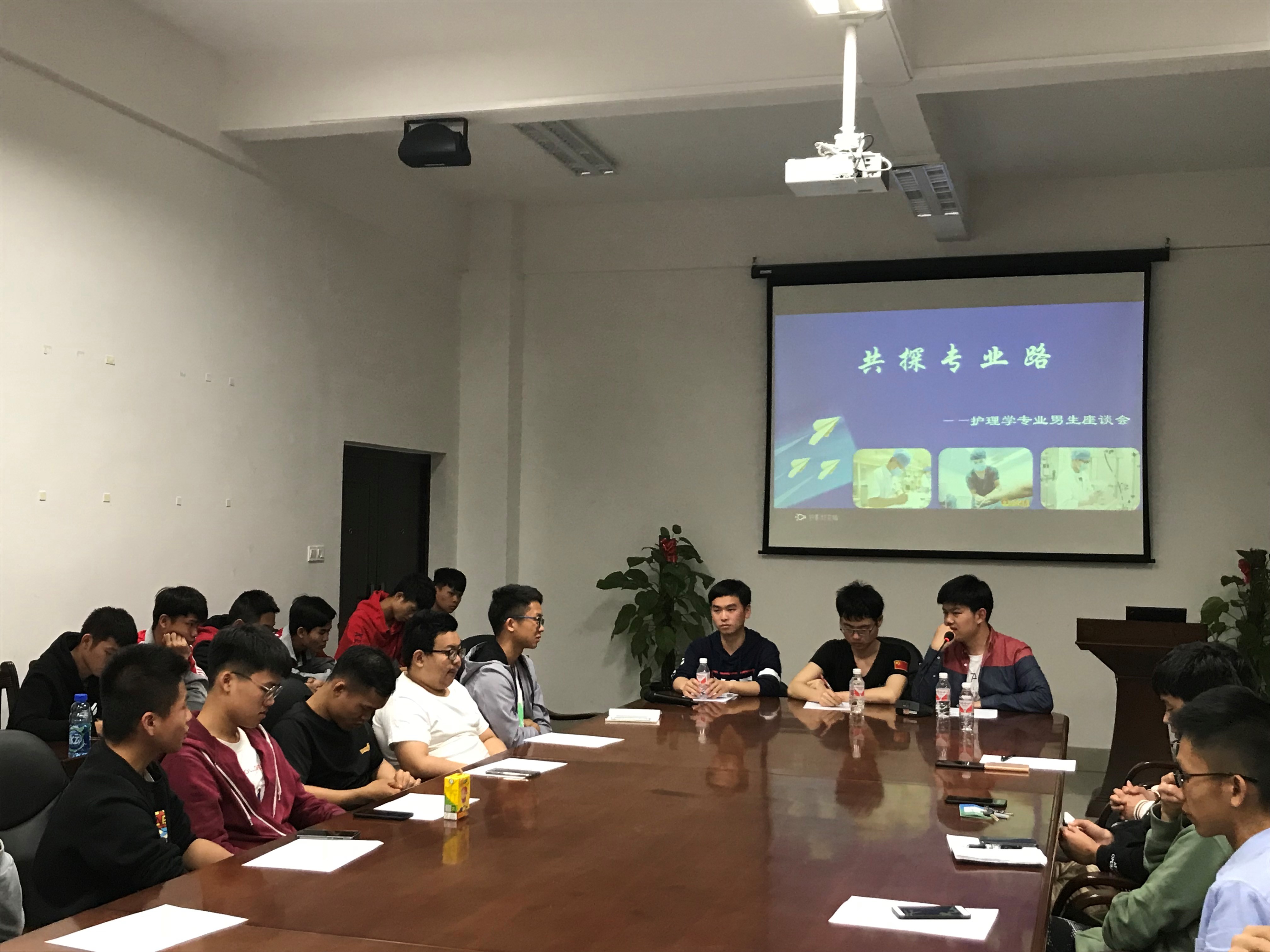 4月8日,护理学院组织召开了主题为“共探专业路”的男护生专题座谈会。邀请了2014级护理专业张玉东、伊默、全宗俊回校与同学们分享大学四年学习的心得体会,2016、2017级护理学专业50名男生参加了本次座谈会。会议由护理学院学工办主任蓝红霞主持。