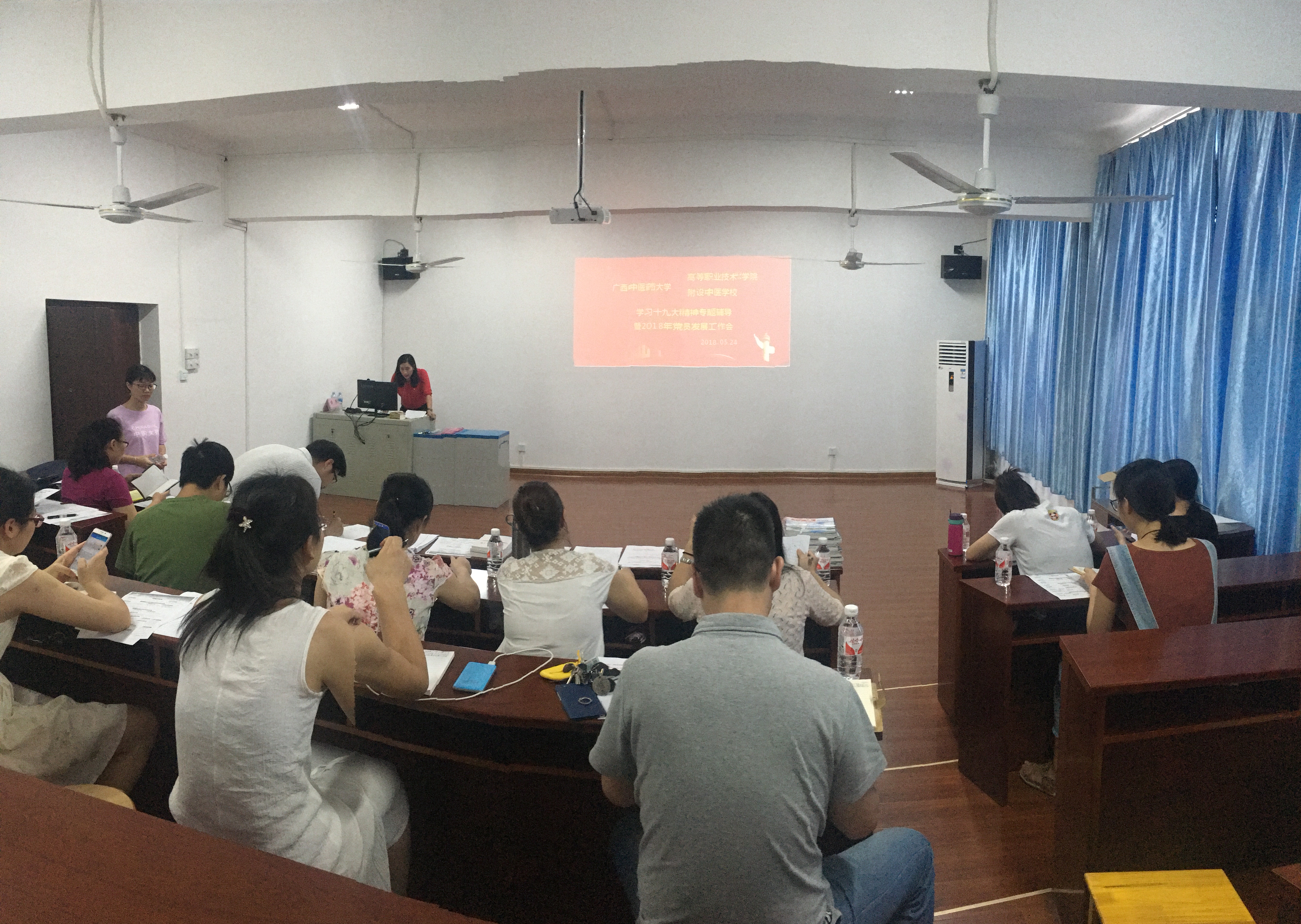 为进一步传达学习党的十九大精神,深入学习党的十九大报告以及做好2018年党员发展工作,高职院、附设中医学校党委在明秀校区高职实训中心402举行学习党的十九大精神专题辅导暨2018年党员发展工作会, 11个党支部书记以及支委参加会议。