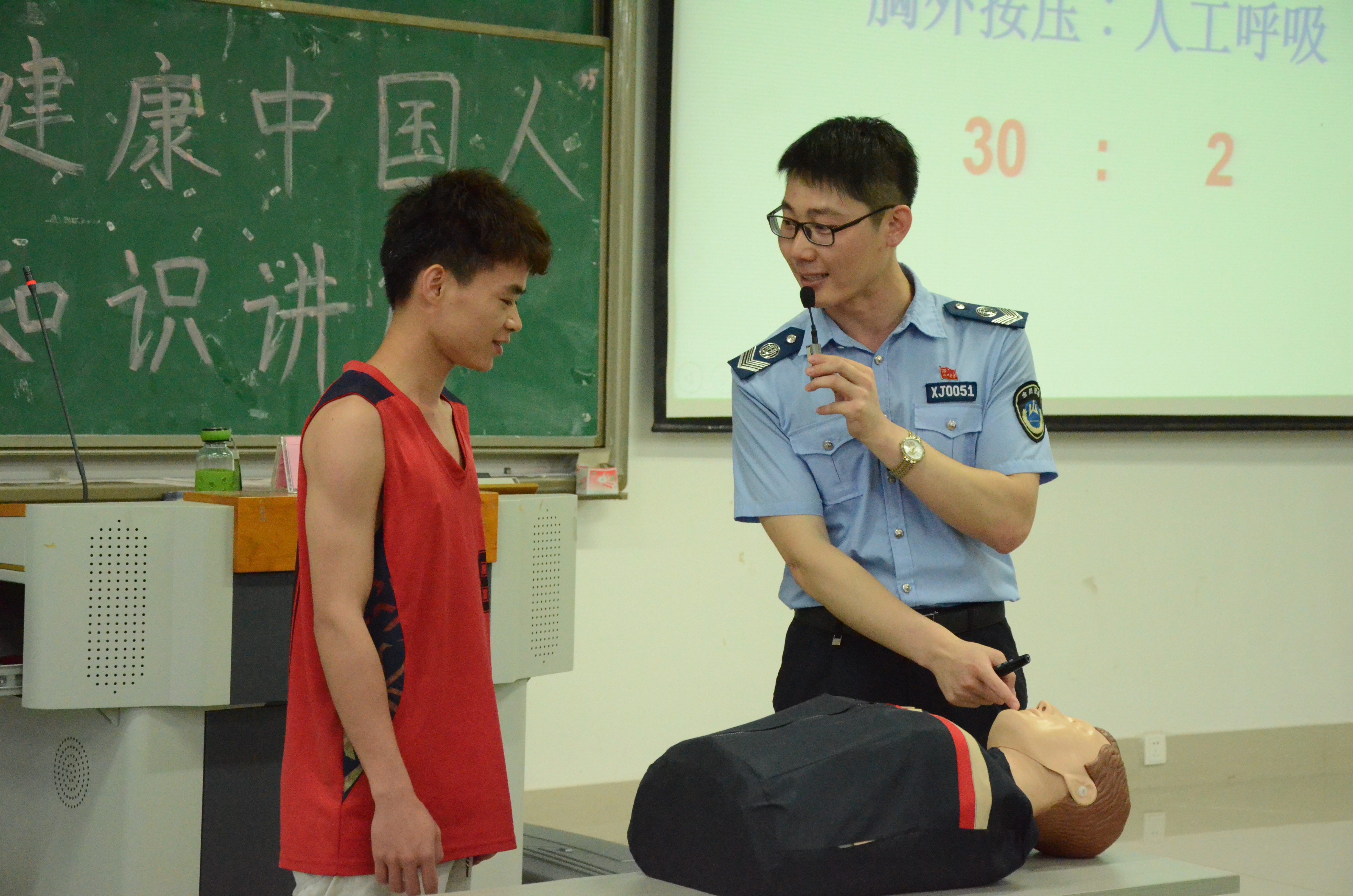 朱亚杰,中国安全健康网宣教科主任,专家讲师团讲师,具有丰富医学知识和授课经验,受邀赴北京、吉林、河南等多地进行健康知识宣讲,场地多达1000多场,听课人员达10万多人,他的课程内容深入浅出,讲课风趣幽默,此次主讲内容主要是CPR现成急救防护知识,如何提高个人免疫力,改善亚健康以及常见慢性病预防等。朱亚杰老师整个授课过程非常专业,语言诙谐生动,现场互动热情,同学们不时爆发出热烈的掌声。讲座结束后同学们意犹未尽,朱老师与学生又进行长时间沟通交流,学生收获颇丰。