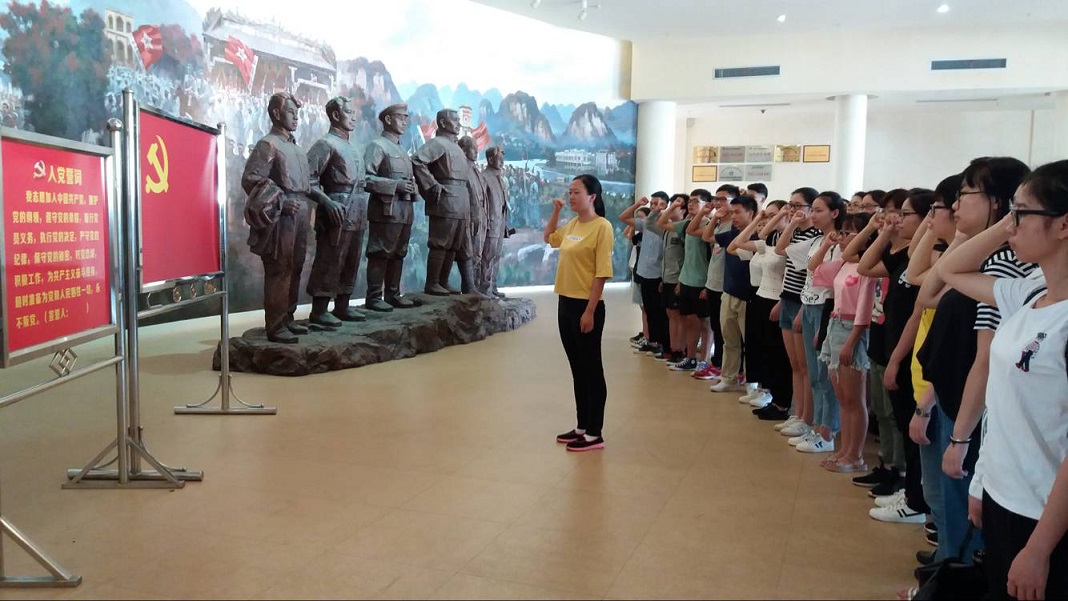 参观伊始,在革命纪念馆门口的浮雕处,黄鑫向学生们介绍了浮雕来历与内容;孙慧玲带领党员在党旗下宣誓。在纪念馆讲解员的带领下,全体成员参观了从大革命时期到新民主主义革命时期的展厅,认真浏览了珍贵的抗战照片,仔细聆听了让人热血沸腾的广西人参战革命的故事。一张张照片、一件件历史遗物、一段段革命故事,加深了党员和入党积极分子对广西革命历史的认识和对党的热爱。
