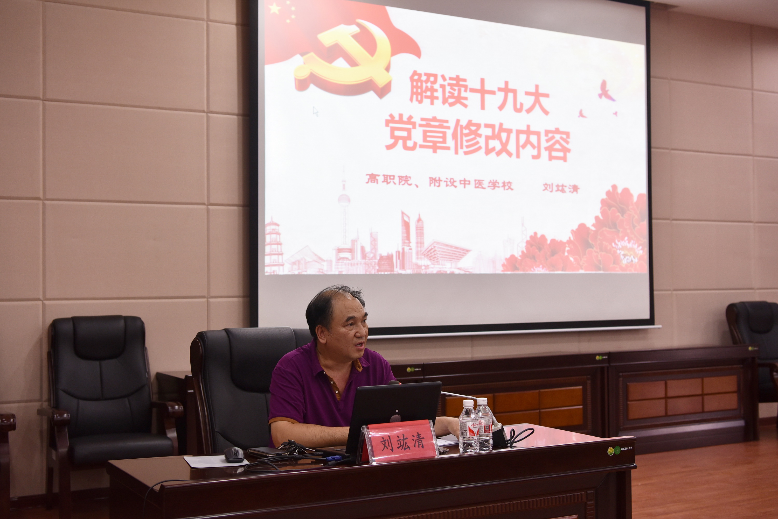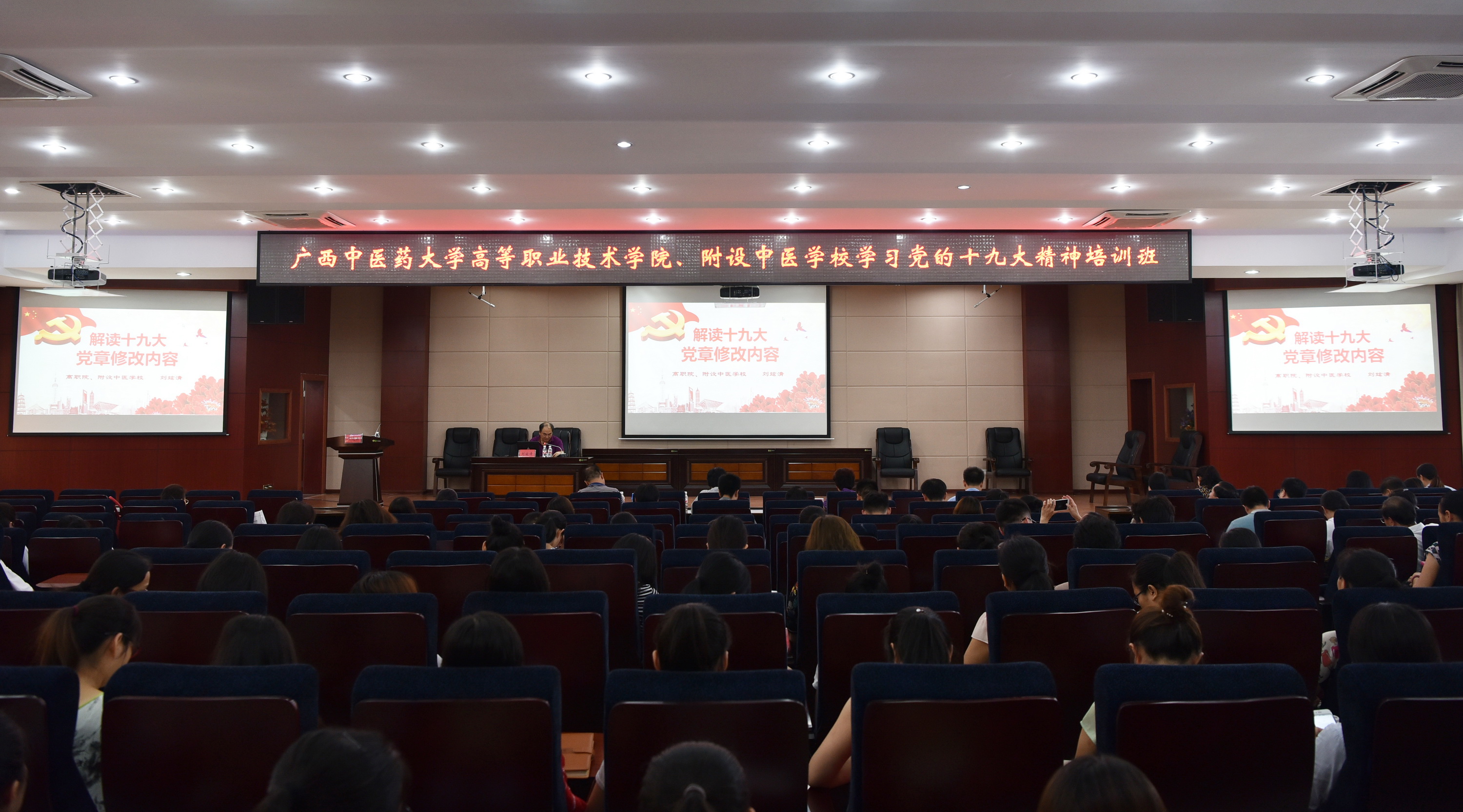 6月19日下午,高职院、附设中医学校党委在北湖校区多功能报告厅举行《解读十九大党章修改内容》培训班,高职院、附设中医学校全体党员、中层干部和学生入党积极分子参加培训,会议由高职院、附设中医学校党委书记邓远美主持。