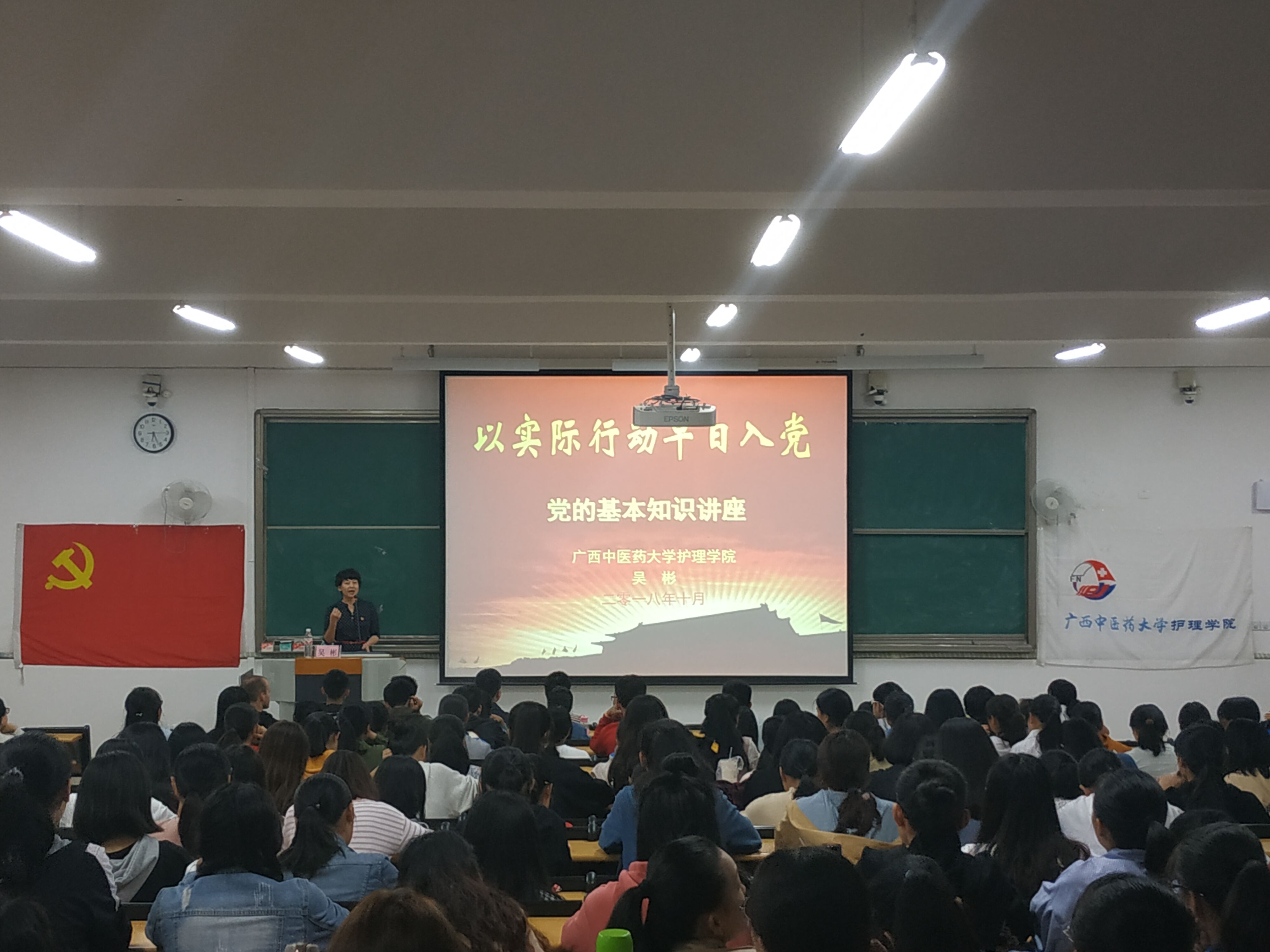 为加强同学们对中国共产党的认识,增强同学们对新时代中国特色社会主义的理解,护理学院于10月11日在仙葫校区开展了新生入学初级党课培训。本次活动由学院党委书记、院长吴彬,党委副书记韩叶芬主讲,分团委书记布银瑶主持,护理学院18级全体新生参与。