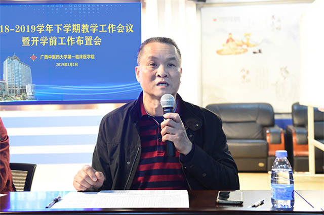 3月1日下午,第一临床医学院在教学楼三楼录播中心召开了新学期教学工作会议。第一临床医学院党委副书记、副院长钟远鸣出席并讲话,全体教研室主任、教学秘书及教学管理人员共50余人参加会议。