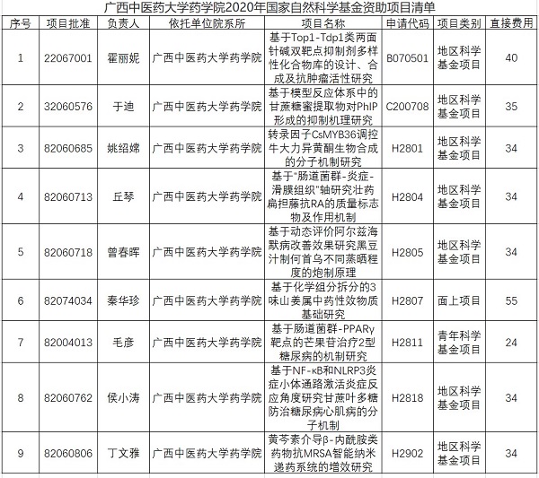 taptap点点体育药学院2020年国家自然科学基金资助项目清单