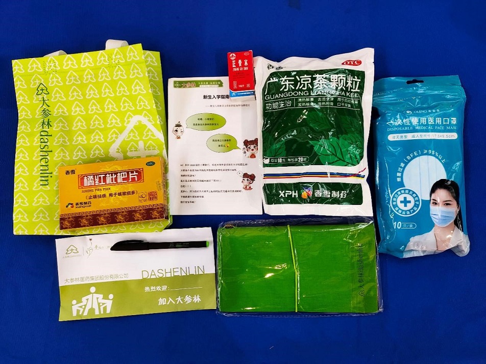 在疫情防控常态化背景下,大参林医药集团倾情支持药学院迎新工作,并为全体新生送上暖心防疫礼包,同时为新生送上新学期祝福。大礼包含有一次性医用口罩、凉茶颗粒、橘红枇杷片、正骨水、笔、笔记本等,深深表达了对新生的关怀和对药学院的支持。
