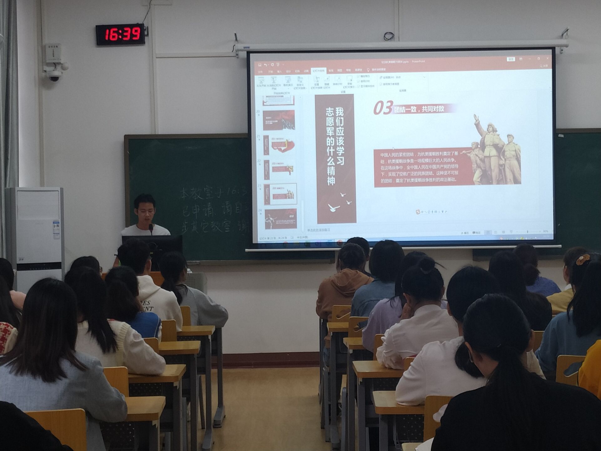 为贯彻落实习近平总书记《在纪念中国人民志愿军抗美援朝出国作战70周年大会上的讲话》精神,发扬伟大的爱国主义精神和革命英雄主义精神,10月26日高等职业技术学院团学社学生干部团支部78名共青团员在明秀校区时珍楼204教室开展“缅怀先烈,铭记历史,纪念抗美援朝七十周年”主题团日活动。