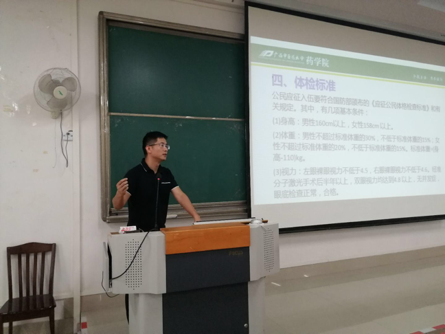 为深入贯彻落实学校征兵工作会议精神,激发药学院适龄应届毕业生的参军报国热情,5月16日晚,药学院在教学楼1-305教室举行了2021年秋季征兵宣传动员会议。300余名2021届毕业生参会,药学院国防辅导员吴玉峰主持了会议并作了征兵宣传动员。
