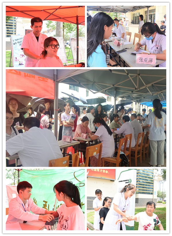 上午10时许,无惧骄阳火辣,学院师生代表近百人在五和食堂搭起义诊服务点,患者打着雨伞排长队等候就诊咨询。义诊分设中医内科、妇科、男性科、儿科、中医骨伤科、美容科诊疗、推拿按摩、学业辅导、心理疏导等组别,基础医学院党委书记龚名师、院长林江、副书记龙春莉、副院长夏猛、邓鑫以及杨力强、蒋筱、张亚萍、张静、贾微、刘含、王文杰、韦玉娜、伍冠一、徐世富、范蓉、黄德伦、黎明星、和卫宾、张翼鹏等专家教授师生代表现场提供免费诊疗、推拿按摩、心理疏导、学业辅导、量血压等至诚服务。杨力强老师、蒋筱等教师细致耐心地询问病情,查舌诊脉,与学生详细分析引起疾病的病因病机,治则治法,选方用药及方解。学业辅导组范蓉,伍冠一等老师用思维导图、图表等多种方式为学生学习指点迷津,讲授学科难点,传授具体策略和方法。心理疏导组黎明星、陈正兴等教师倾听学生倾诉,帮助学生树立学习目标,排除学习压力与干扰,提高学习专注度和学习效率提出了具体可行的建议。按摩组的学生体验了中医骨伤科正骨和推拿按摩的神奇功效。