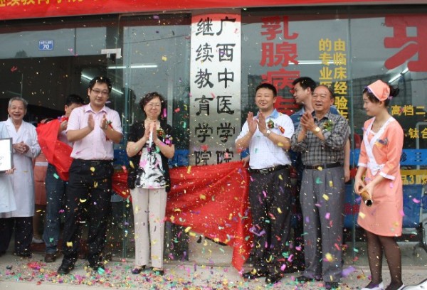 5月8日上午,广西中医学院继续教育学院实训中心揭牌暨青秀区希望诊所团支部授匾仪式在南宁市三岸门诊隆重举行。成人教育学院院长秦祖杰,直属党委书记严淑珍,直属党委副书记肖华业,成人教育学院副院长黄瑞诚,共青团南宁市青秀区委书记黄贤斌,南宁市三岸门诊主任黎文娟等领导、嘉宾出席了仪式。
