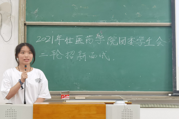 2021年10月15日下午,壮医药学院团委学生会于仙葫校区教学楼1-207召开了团委学生会2021级招新大会。本次会议邀请到了壮医药学院团委书记刘婷老师出席,壮医药团委学生会全体学生干部以及进入二轮面试的28位新生参加了此次面试。