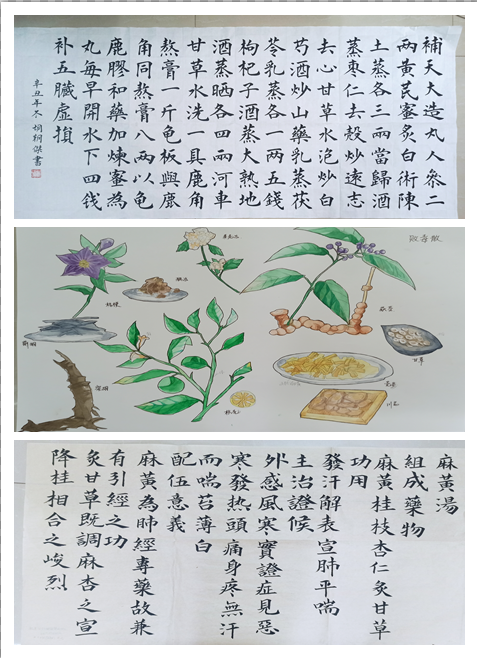 本次主题知识绘画比赛,共收集参赛作品351副,同学们用手中的毛笔、硬笔、画笔等,利用所学知识,发挥个人创作力,书写和绘画出一幅又一幅惟妙惟肖、妙笔生辉的作品。今方剂之数,不知凡几;今草药之数,不知凡几。麻黄汤、小柴胡汤、达原饮等方剂,流芳百世;甘草、桂枝、芍药等草药,依然芬芳。从古至今,方剂和草药都蕴于中医悠久文化中,它们是中华民族祖先留下来的宝贵文化遗产,亦是中华民族中医文化的珍粹。