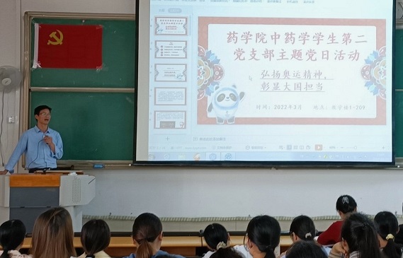 3月15日下午,药学院中药学学生第二党支部在仙葫校区1-209教室开展了“弘扬奥运精神,彰显大国担当”主题党日活动。药学院党委副书记李豫萍出席指导活动,支部党员、党员发展对象与入党积极分子参会,支部书记凌勇威主持活动。