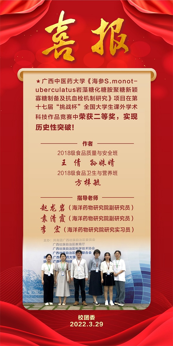 【喜讯】药学院学子荣获第十七届“挑战杯”二等奖,实现历史性突破! 作者:文/吴玉峰 日期:2022-03-30 点击数: 次 分享到: 近日,药学院学子王倩、孙姝婧、方梓毓代表点点体育参加第十七届“挑战杯”全国大学生课外学术科技作品竞赛,凭借《海参S.monot-uberculatus岩藻糖化糖胺聚糖新颖寡糖制备及抗血栓机制研究》项目在大赛中荣获二等奖,实现历史性突破! 打印正文 关闭本页