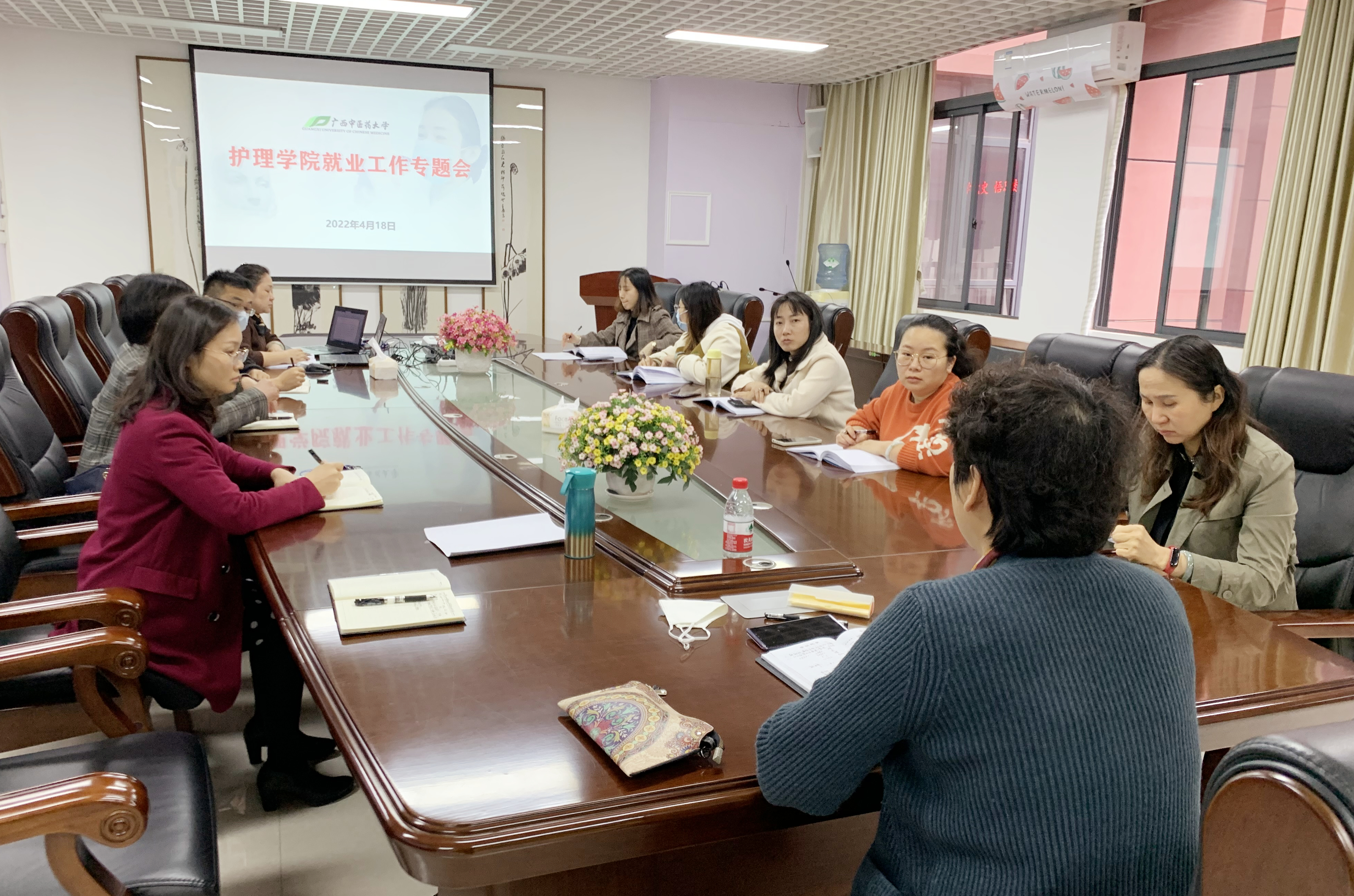 学生工作办公室主任蓝红霞作护理学院2022届毕业生就业情况专题汇报。参会人员分别就如何拓宽就业渠道等积极建言献策。