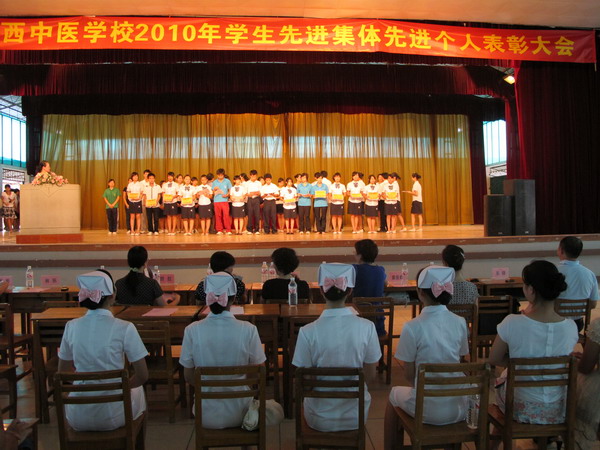 2010年7月16日下午3:00,广西中医学校2010年学生先进集体、先进个人表彰大会在北湖校区礼堂举行。广西中医学校历来在学生教育管理中非常重视对学生先进集体、先进个人的培养与表彰,注重通过表彰先进,树立典型,发挥先进集体、先进个人在学校各方面的模范带头作用,营造良好的学风、校风。出席表彰大会的学校领导有广西中医学校校长吴彬、广西中医学校党委副书记罗艺徽、广西中医学校副校长周琦及学校各科室负责人、各相关老师。