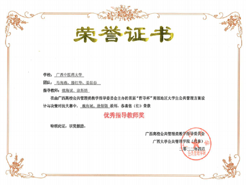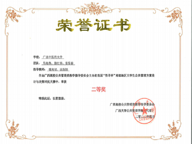 4月8日上午9,由广西高校公共管理类教学指导委员会举办的首届“哲寻杯”南部地区大赛正式拉开序幕。由学院魏海斌、涂斯靖两位老师带领2019级公共事业管理专业马海燕、滕红华和姜显春三位同学代表参赛。