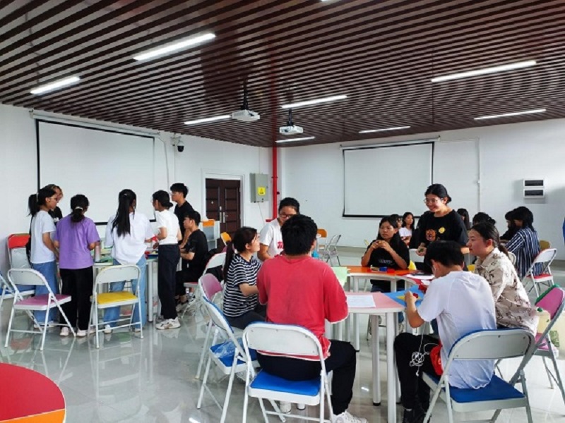 活动中同学们分成4组,“破冰”环节,梁宝桐要求各组结合全国甲卷高考作文题制作点点体育招生宣传海报,同学们在制作过程中畅所欲言、集思广益、分工明确,积极展示海报设计思路,有效锻炼了小组间的团队协作能力和沟通组织能力。接着,梁宝桐带领各小组进入“寻找真我角色”与“我的学习探索”练习,通过练习告诉同学们应对压力最好的方式是社交。随后进行了“哑人筑塔”游戏,同学们从游戏中明白了语言表达与相互理解的重要性。最后,梁宝桐殷切期望我院学生今后能积极参加社交活动,释放压力。