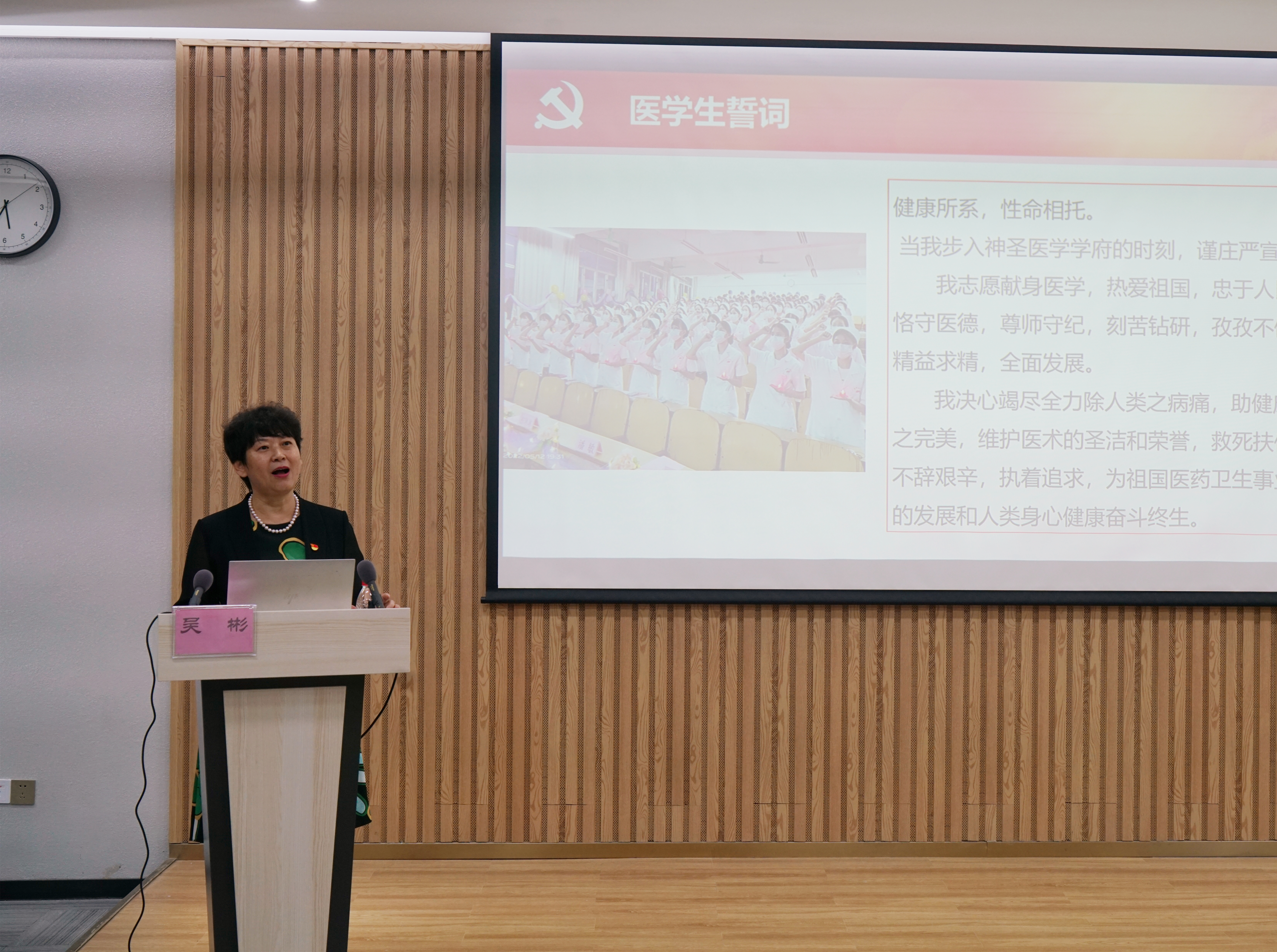 会上,吴彬为即将踏出校园,迈上新征程的毕业生党员作《强国有我,不负韶华,担负起新时代赋予的担当与使命》专题党课。从重温医学生誓词到南丁格尔誓言的解读;从历代共产党人为国家为民族的不畏艰辛到“新冠”战场上的勇毅前行的白衣战士;从学《党章》到争做“四有党员”等,由浅入深的引导毕业生党员们领悟与体会党员的责任与担当,并从专业的角度、职业发展上指导同学们如何落实党员的责任与担当。在毕业寄语中,吴彬希望全体毕业生党员把使命担当、理想信念内化于心,外化于行,从我做起、从小事做起、从身边做起、从此刻做起,培养造就铁一般信念、铁一般纪律、铁一般担当的护理人员,用自己的工作来诠释我们的初心和使命,为党的事业和各项建设不懈奋斗!