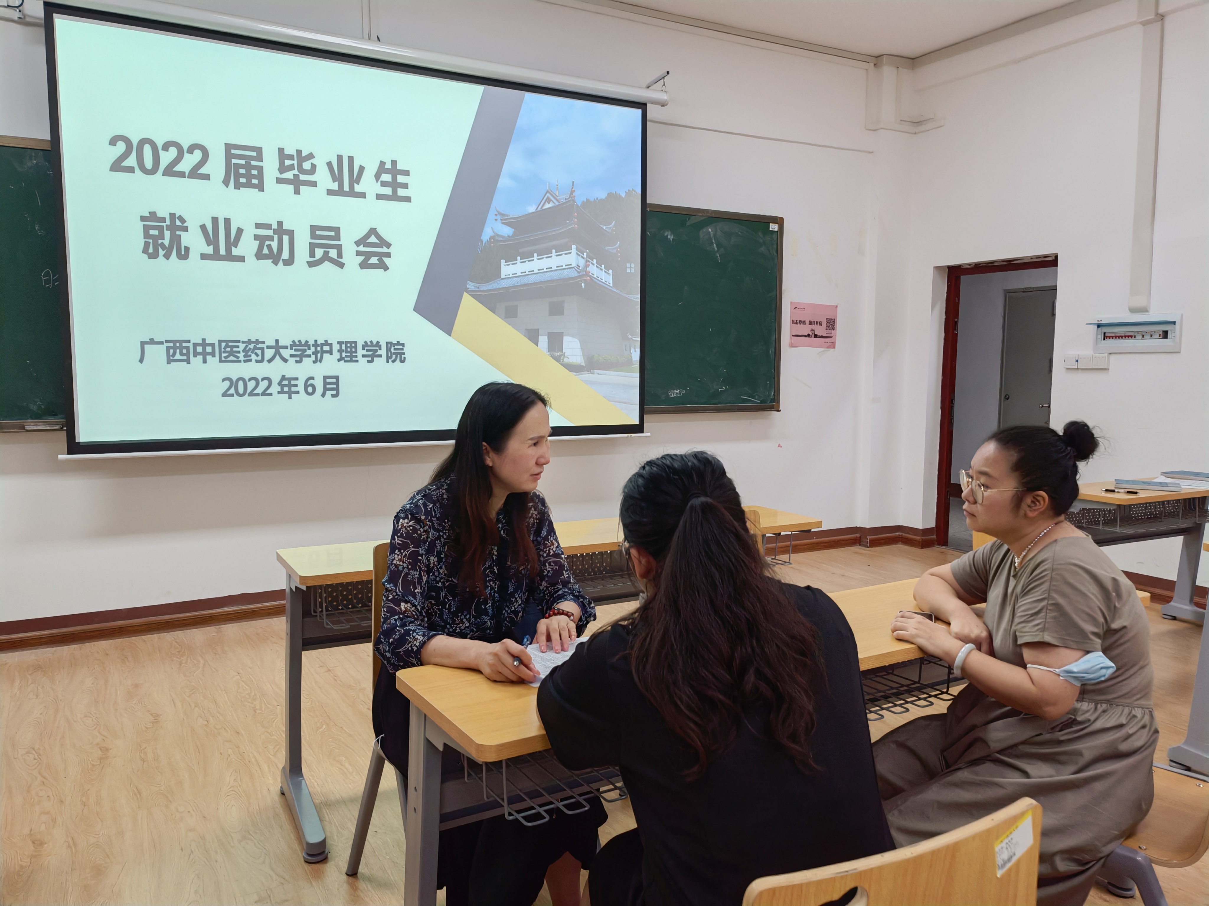 在就业工作推进月活动中,学院党委每周召开毕业生就业分析会,学院党委副书记韩叶芬带领全体辅导员对2022届毕业生的就业情况进行详细的分析,对未就业的学生召开就业再动员大会及开展一对一的谈话与帮扶。同时,积极、认真组织学生参加学校6月8日至6月13日举办的夏季双选会、广西医药卫生类双选会等活动,做到适时发布就业信息、动态了解学生的就业状态,全力推进2022届护理学专业毕业生的就业工作。