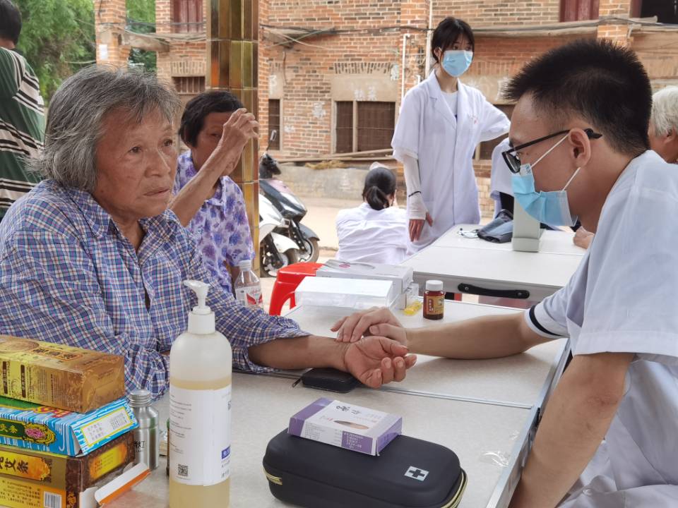 在到达目的地后,团队义诊小组先于居民活动中心处进行义诊场地布置,同学们纷纷将按摩床、血压计以及各类义诊设备摆放于凉亭内,向村民宣传本次社会实践活动,邀请村民们前来义诊。实践成员们积极运用在校内所学习的体格检查、中医壮医诊法以及按摩针灸手法为辛苦劳作的叔叔阿姨们放松肌肉,缓解病痛。此外,在为村民们进行一系列体格检查后,同学们向村民科普了保健知识以及养生知识。