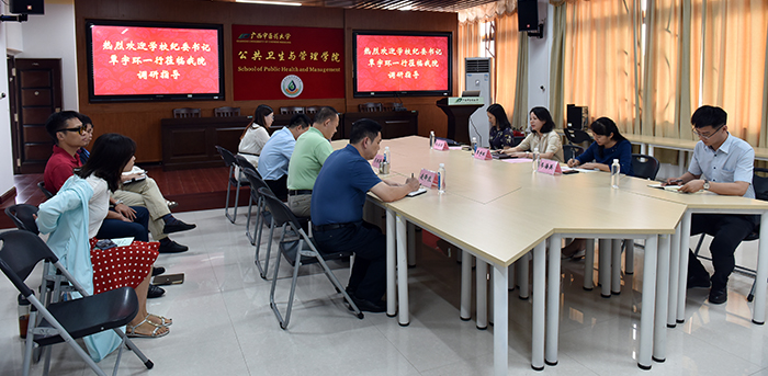 9月27日下午,学校纪委书记覃宇环到公共卫生与管理学院开展工作调研,学校纪委副书记韦海英、党委办公室副主任杨海洁陪同。调研会由公共卫生与管理学院党总支书记李怀泽主持,副院长李海做学院发展情况汇报,学院领导班子成员、科级干部参加。