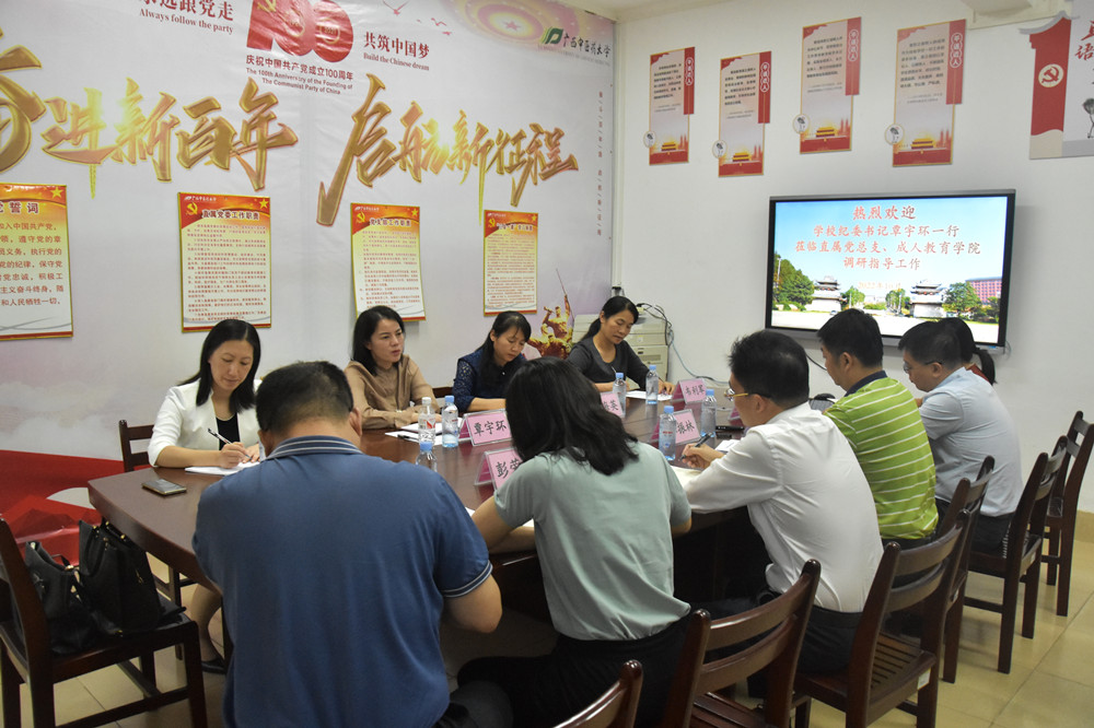 在直属党总支(成人教育学院),覃宇环听取了直属党总支副书记、成教院副院长覃振林,成教院副院长黄瑞诚关于直属党总支、成教院的情况汇报,对直属党总支、成教院近年来所取得的成绩给予了充分肯定。