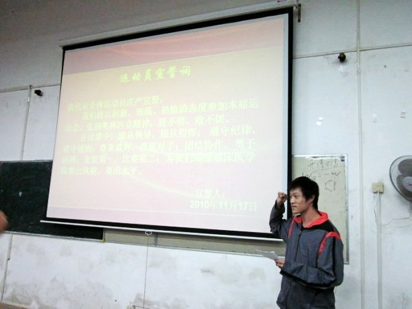 大会首先由瑞康临床医学院学生会体育部部长马鹏同学汇报了瑞康临床医学院在历届校运会上取得的优异成绩以及本届校运会的筹备情况和训练情况,接下来瑞康临床医学院分团委汪国翔副书记和教务学生科郑光珊老师分别上台作了动员讲话。汪国翔老师首先对本届校运会我瑞康临床医学院在面临人员少、时间短的挑战和困难下,07级和10级的同学能够克服重重困难,积极踊跃投身筹备和训练工作的宝贵精神表示了赞赏和肯定,并从增强自身体质、提高集体凝聚力、提升就业竞争力等几个方面对全体参赛运动员做出了振奋人心的动员,同时对后勤保障工作的落实提出了具体要求。郑光珊老师对新老生积极参与运动会的态度表示赞赏,同时希望10级的新生能够多挖掘特长,发挥潜能,为校运会取得满意的成绩打下坚实的基础。最后,瑞康临床医学院运动员代表王充带领全体运动员进行了庄严的宣誓,表示全体运动员将会努力拼搏,再创辉煌。大会在运动员们斗志昂扬的誓言中落下帷幕。