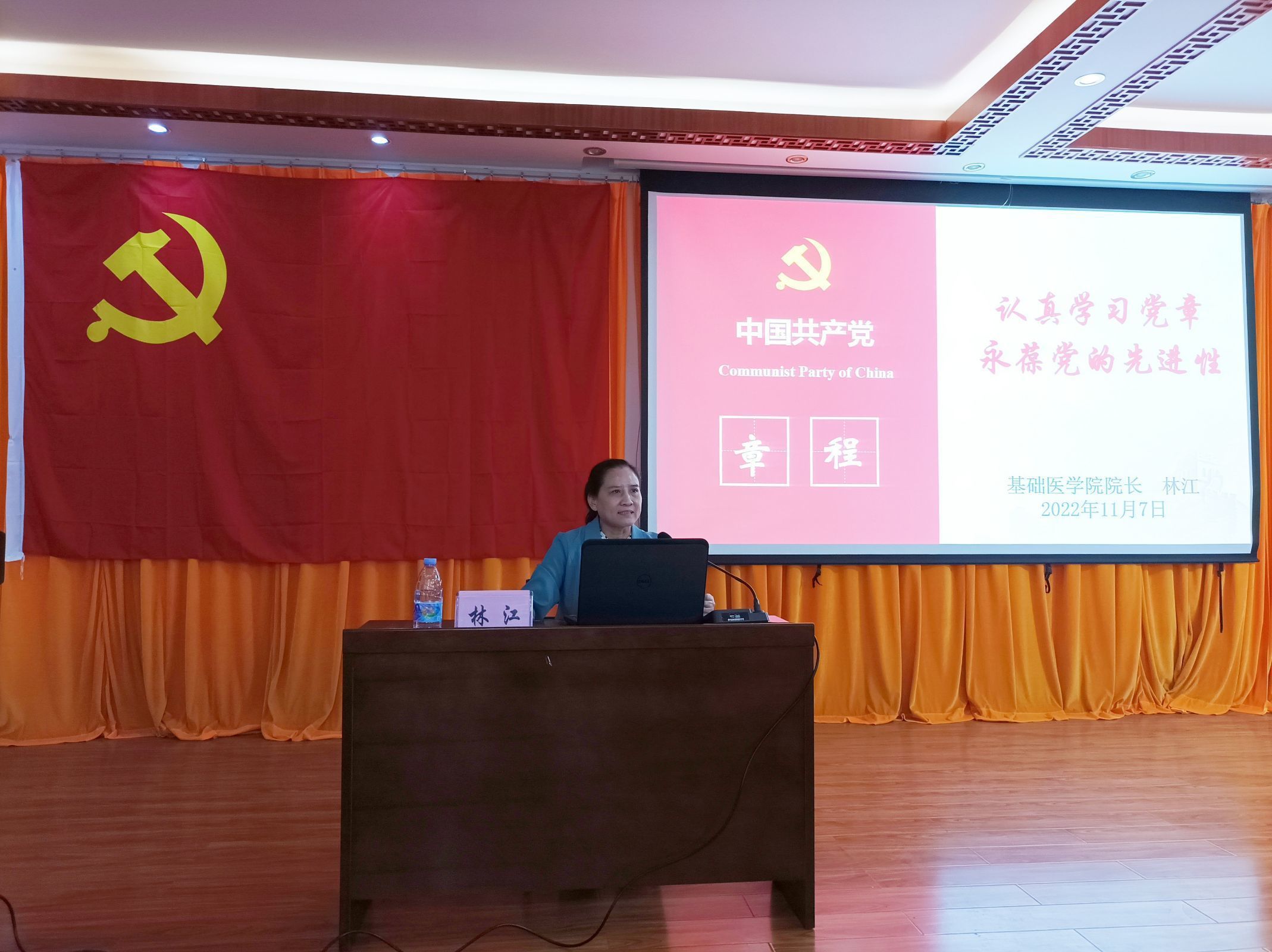 为深入学习贯彻党的二十大精神,认真对照新党章,形成自觉学习党章,严格遵守党章,坚决维护党章的良好氛围,11月8日下午,基础医学院院长林江为第23期发展对象和第25期入党积极分子培训班全体学员上了一堂题为《认真学习党章永葆党的先进性》的专题党课。